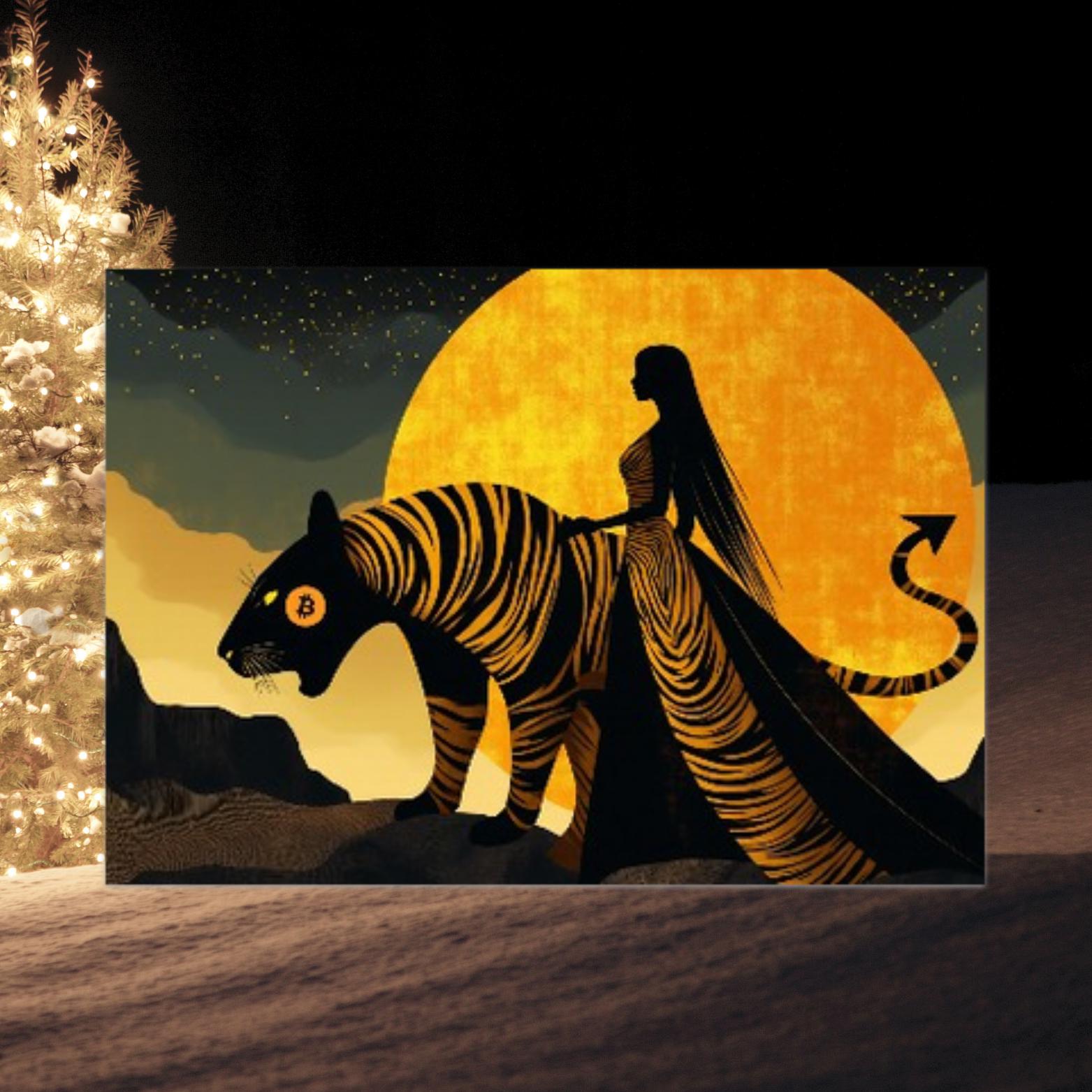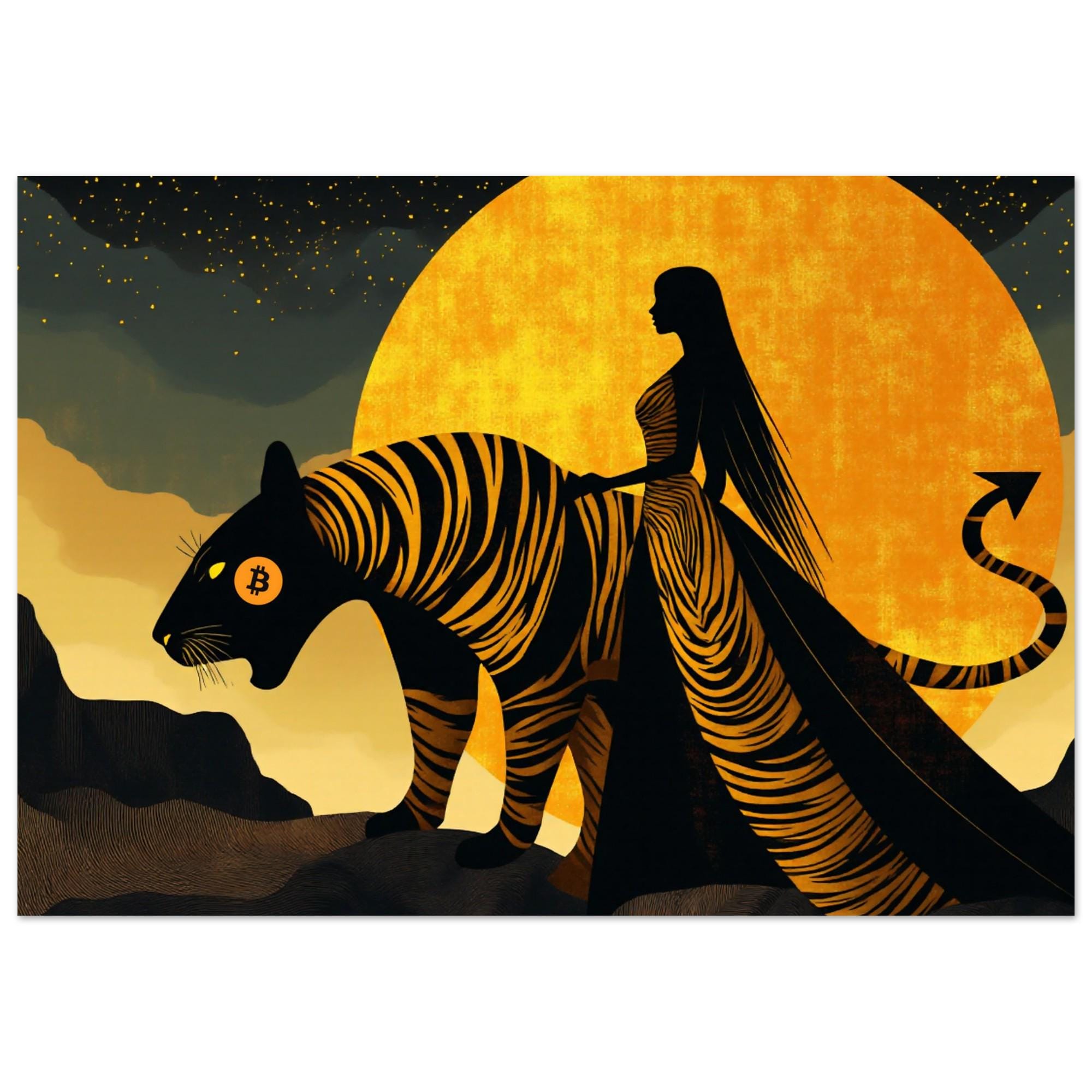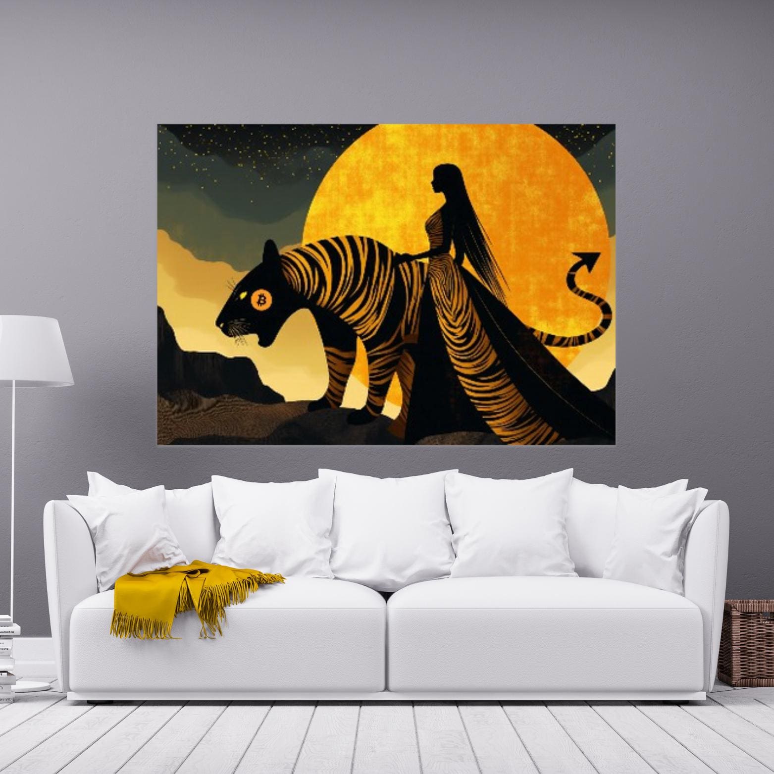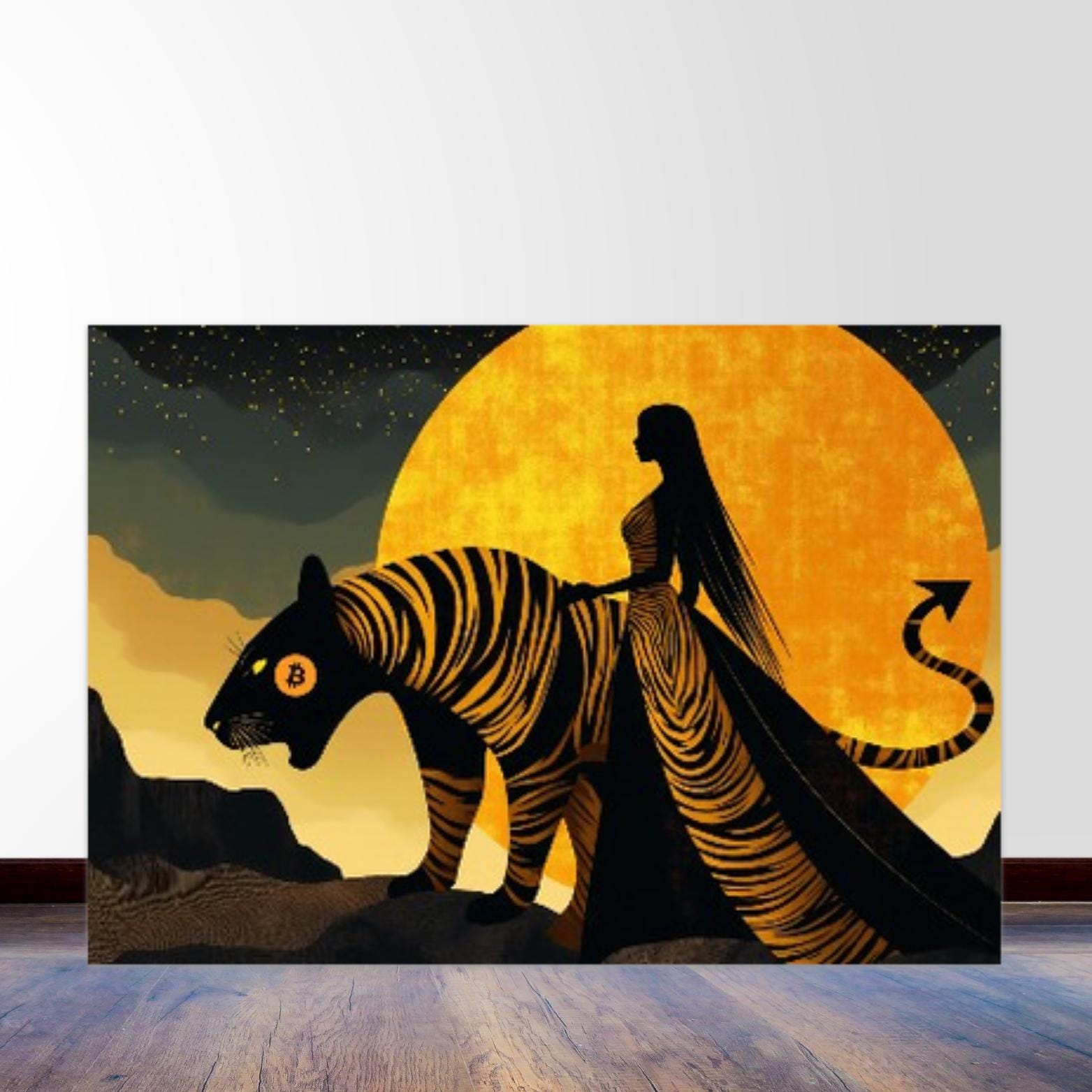 Ride the Wild Pulse of Digital Gold: The Bitcoin Tiger Rider Step into a visionary realm where the blockchain's untamed spirit comes alive with The Bitcoin Tiger Rider. A striking silhouette of a long-haired visionary astride a powerful tiger, its forehead marked with the iconic ₿ symbol, prowls beneath a cosmic orange sun dotted with defiant stars. Her flowing gown and the tiger's tail weave a surreal dance of motion and mystery, blending nature’s raw energy with the revolutionary heartbeat of Bitcoin. This isn’t just art—it’s a bold celebration of resilience, scarcity, and the fearless HODLers who shape the future, capturing the wild essence of 2025's digital frontier. Ideal for the modern trailblazer’s office, the Bitcoin enthusiast’s sanctuary, or any space craving a burst of surreal elegance. The vibrant orange and black palette ignites any wall, transforming it into a gallery of empowerment and futuristic flair—where every glance reinforces your conviction in the digital age. Premium Printing Options – Crafted to Endure Like Your Stack.