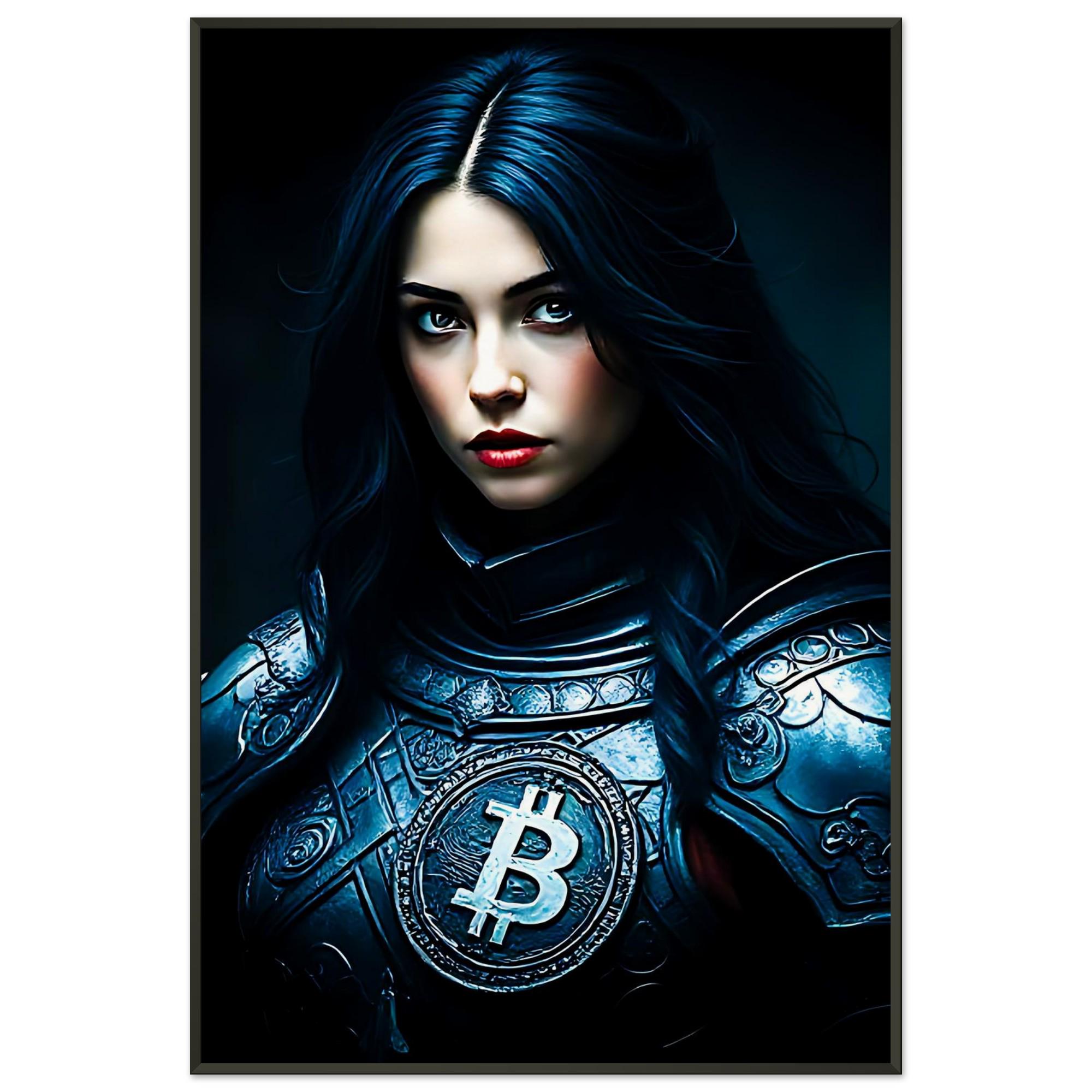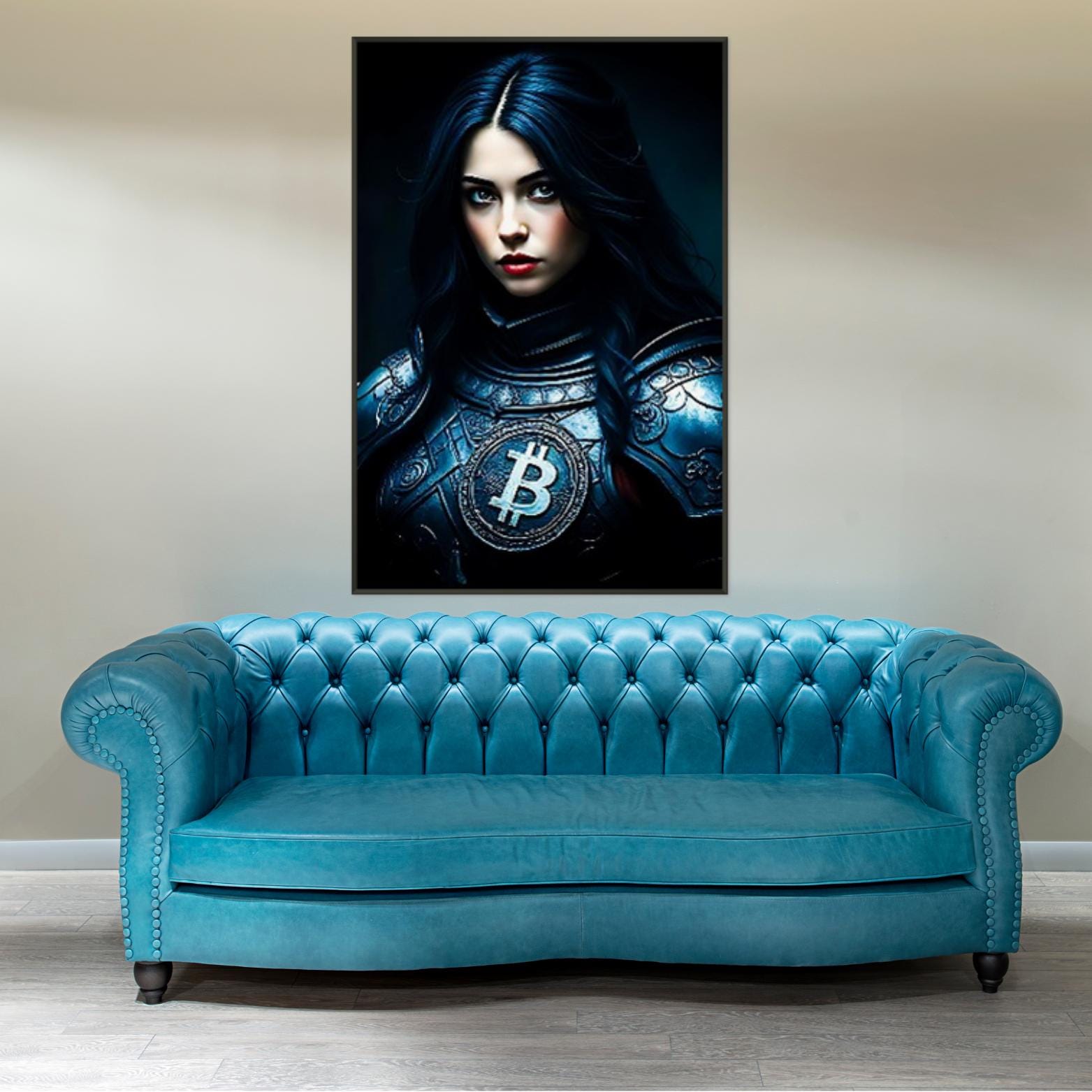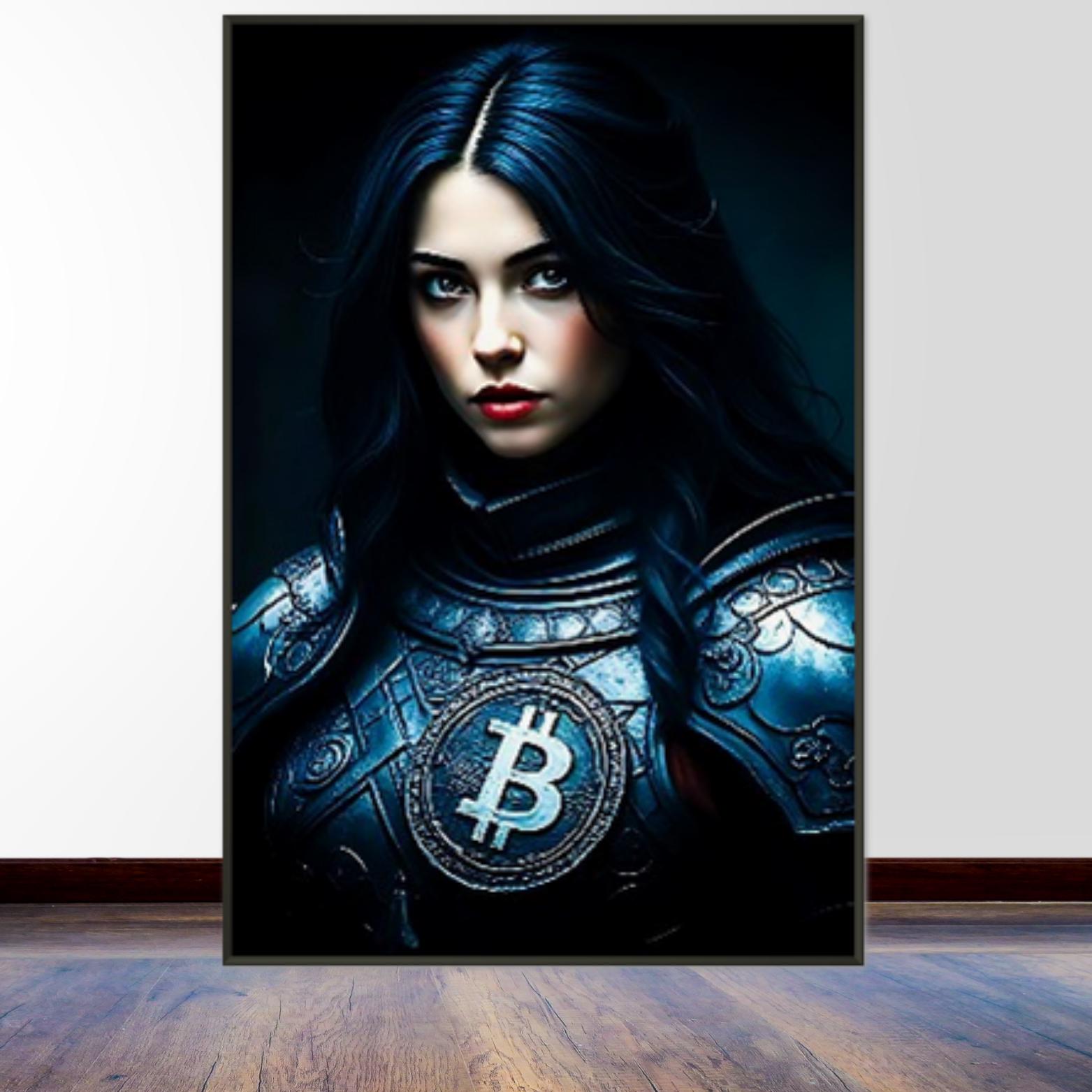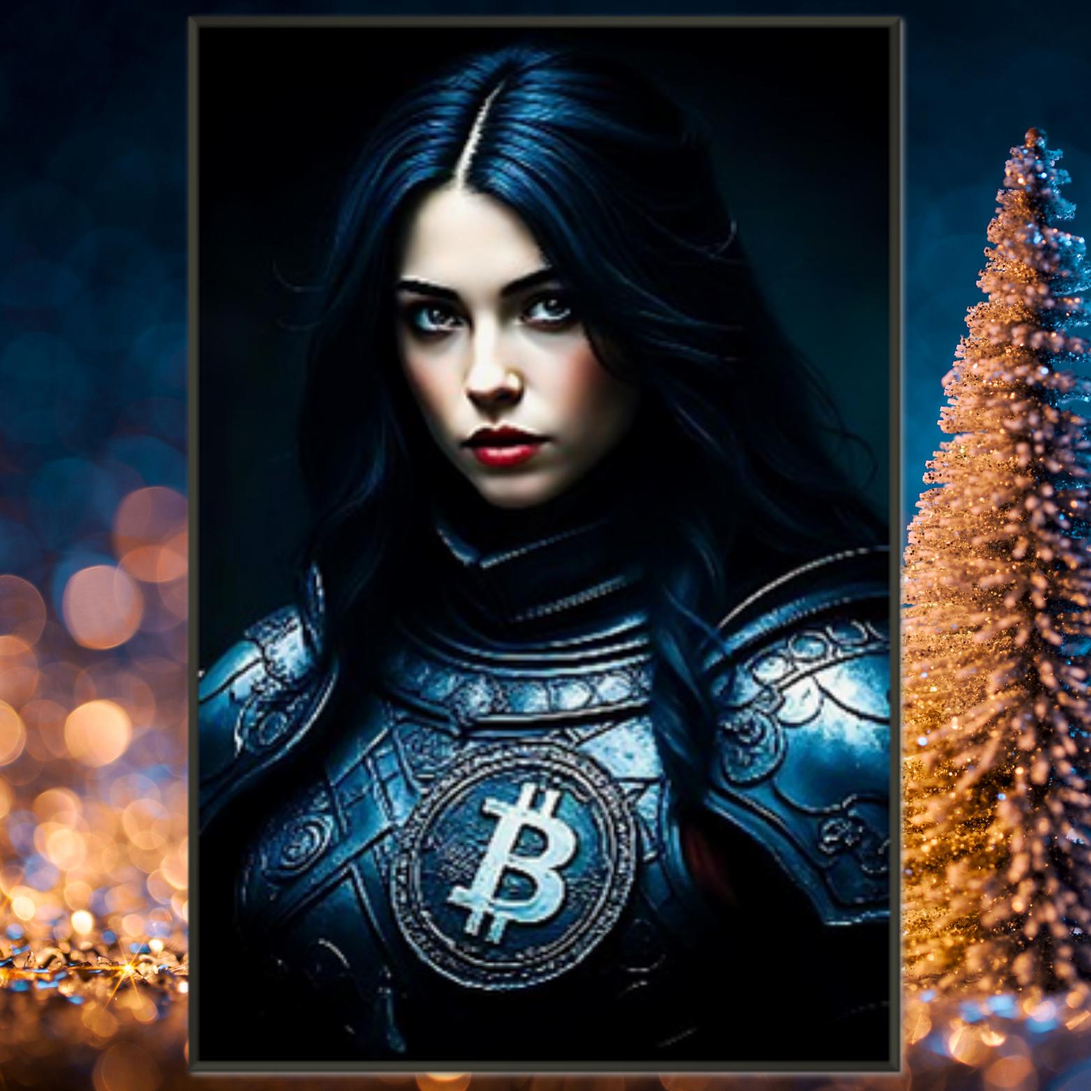 Step into a coded realm of timeless beauty and digital defiance with Bitcoin Baroque Warrior Maiden I, the inaugural guardian of our exclusive three-piece Warrior in Heaven’s Garden trilogy. This fierce maiden, clad in ornate armor shimmering with intricate gold filigree and crowned with a luminous ₿ emblem, emerges from the shadowed elegance of Baroque artistry. Her striking portrait, inspired by Caravaggio’s dramatic chiaroscuro and the refined grace of Rococo, captures a moment of sovereign strength—a testament to Bitcoin’s revolutionary spirit of freedom. Rendered with meticulous detail, her armor tells a story of resilience, merging classical mastery with the modern ethos of digital currency.