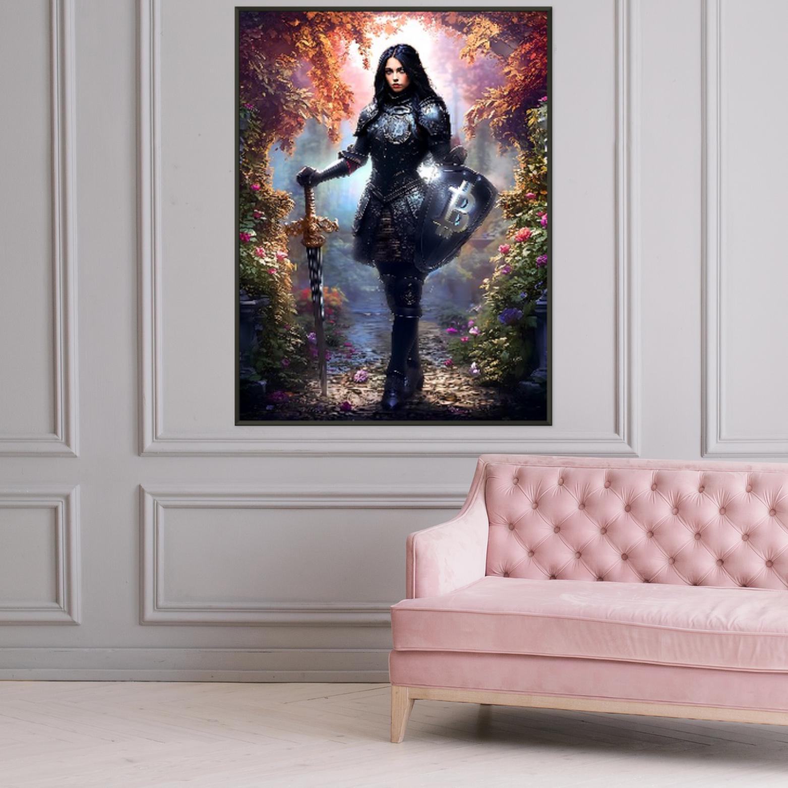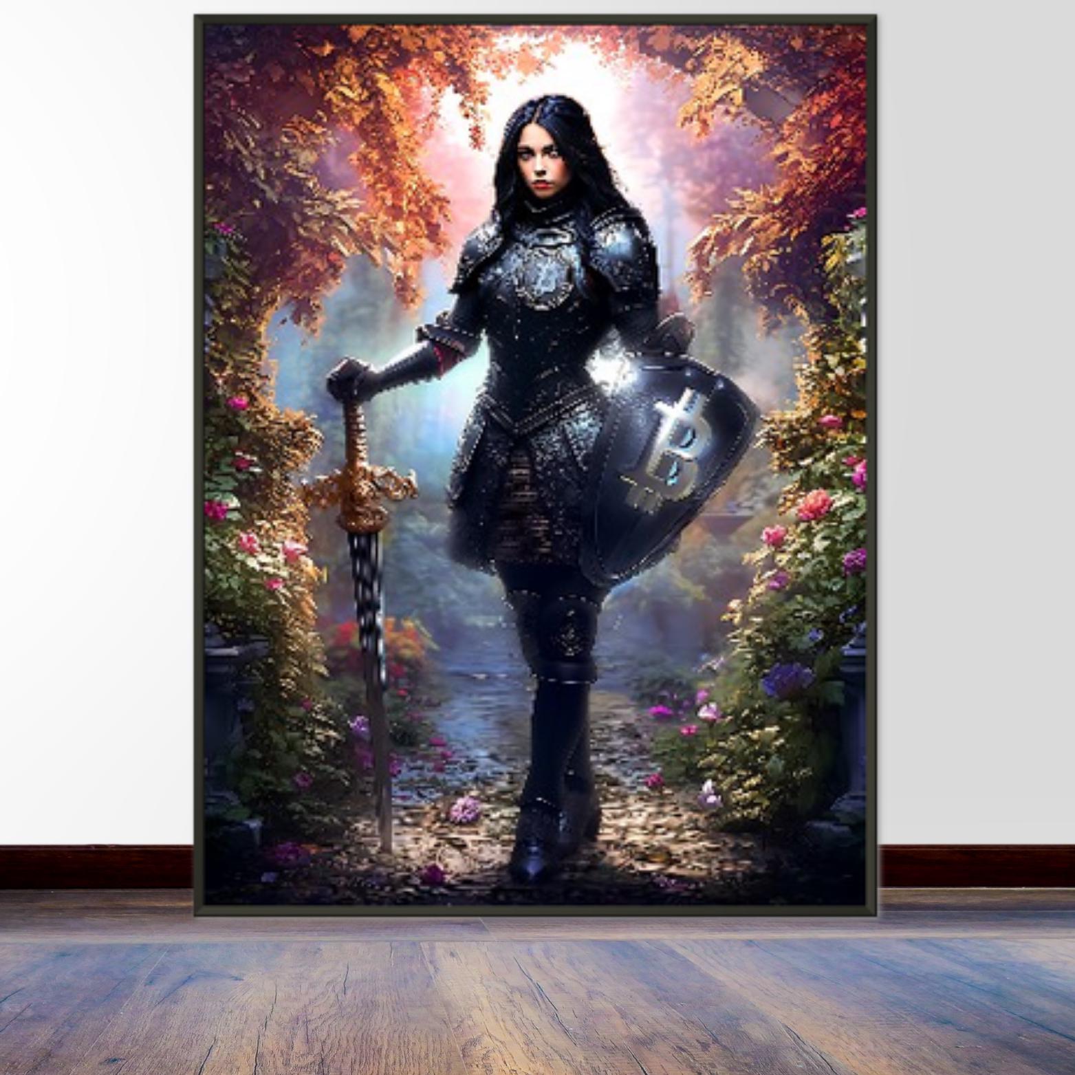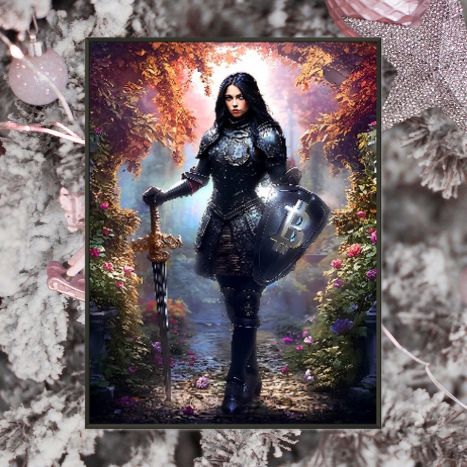 Complete your journey with Bitcoin Baroque Warrior Maiden III, the final guardian of our enchanting three-piece Warrior in Heaven’s Garden trilogy. This armored sovereign, crowned with a radiant ₿ emblem, surveys a vibrant floral paradise of lush roses and vines, where Baroque grandeur intertwines with Rococo charm. Drawing from Caravaggio’s dramatic lighting and Watteau’s delicate pastoral scenes, her presence is a powerful tribute to Bitcoin’s coded legacy—a fusion of timeless beauty and digital revolution. The floral backdrop, rich with color and life, contrasts her steel resilience, symbolizing the balance of nature and protection.