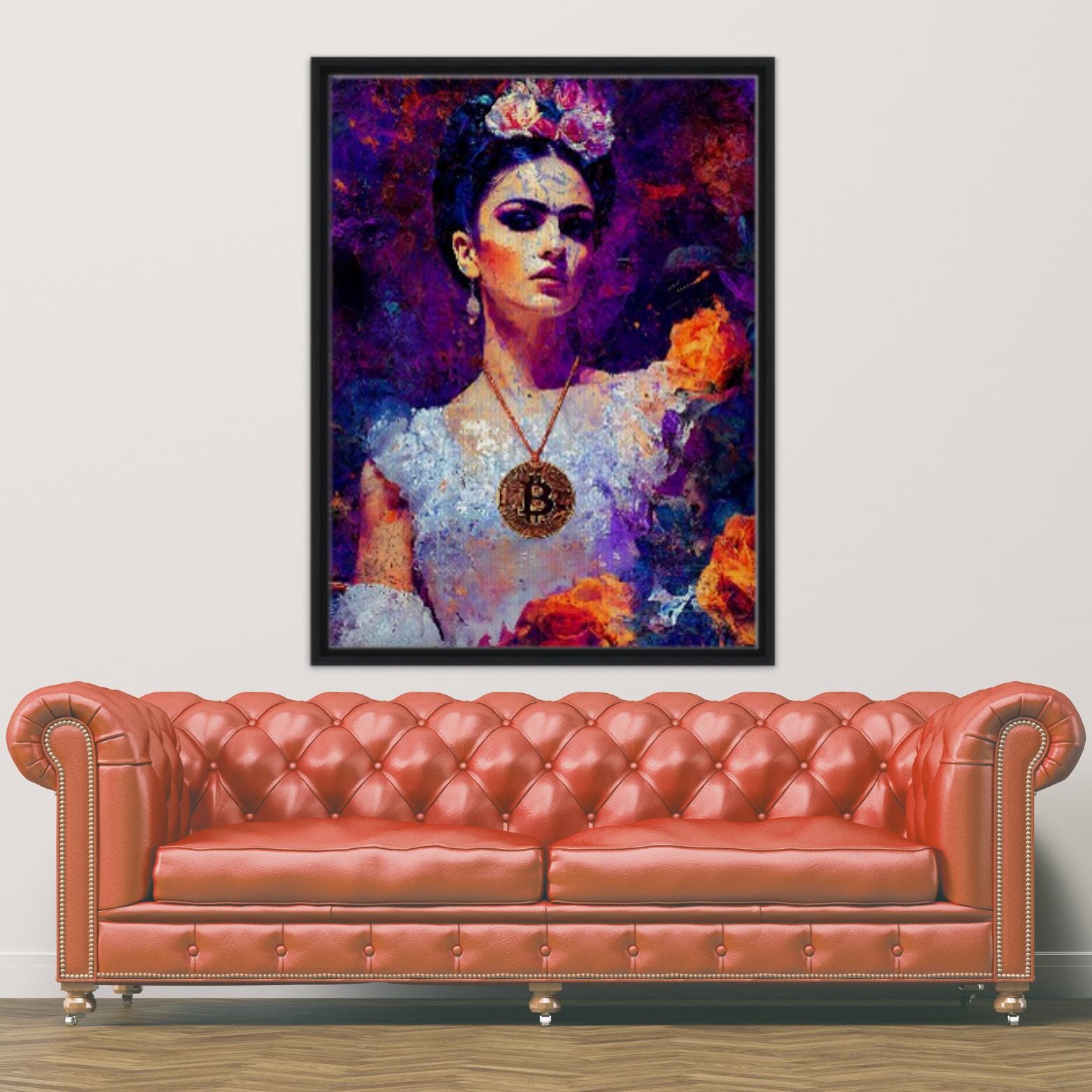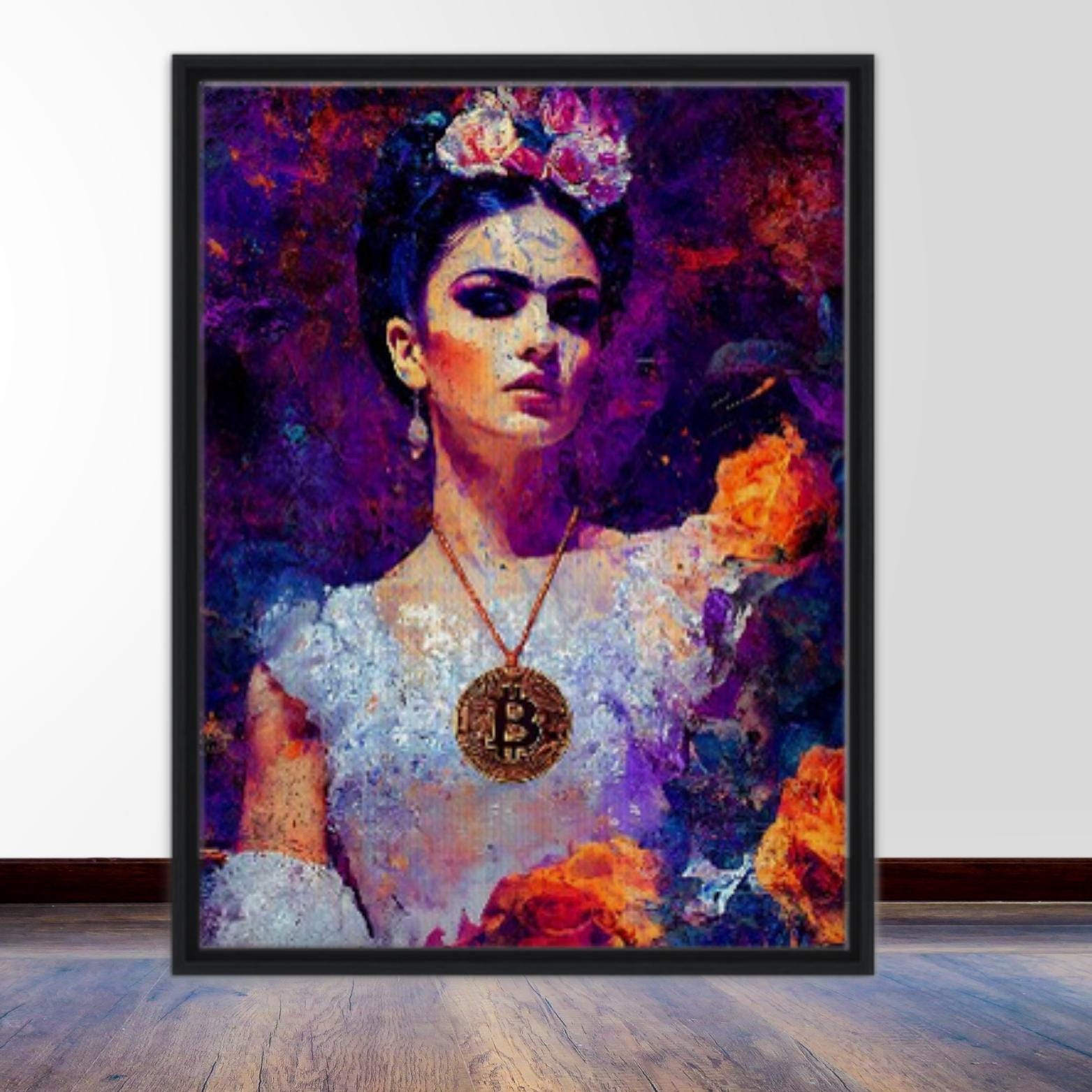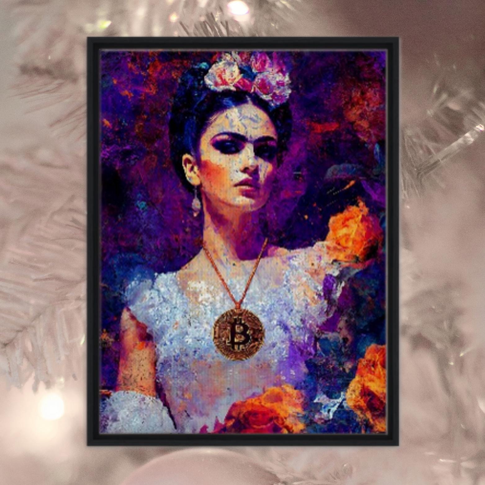 Elevate your space with this framed canvas print, a masterpiece that reimagines the indomitable spirit of Frida Kahlo through the lens of a new financial era. Executed with vivid color harmonies and symbolic precision, this portrait features a feminine figure adorned with a vibrant floral crown and a serene, unyielding gaze—evoking endurance, individuality, and the intimate connection between art and sovereignty, a nod to Kahlo’s legacy of self-expression. At the heart of this work, a Bitcoin medallion replaces traditional adornment, serving as a modern emblem of value and freedom, merging personal identity with universal resilience. Rich violet and golden undertones recall the expressive depth of Kahlo’s palette, while textured layers of rough-paint strokes reveal both fragility and defiance, bridging emotional realism with digital symbolism. The rich texture of the canvas adds captivating depth, transforming this piece into a gallery-worthy experience.