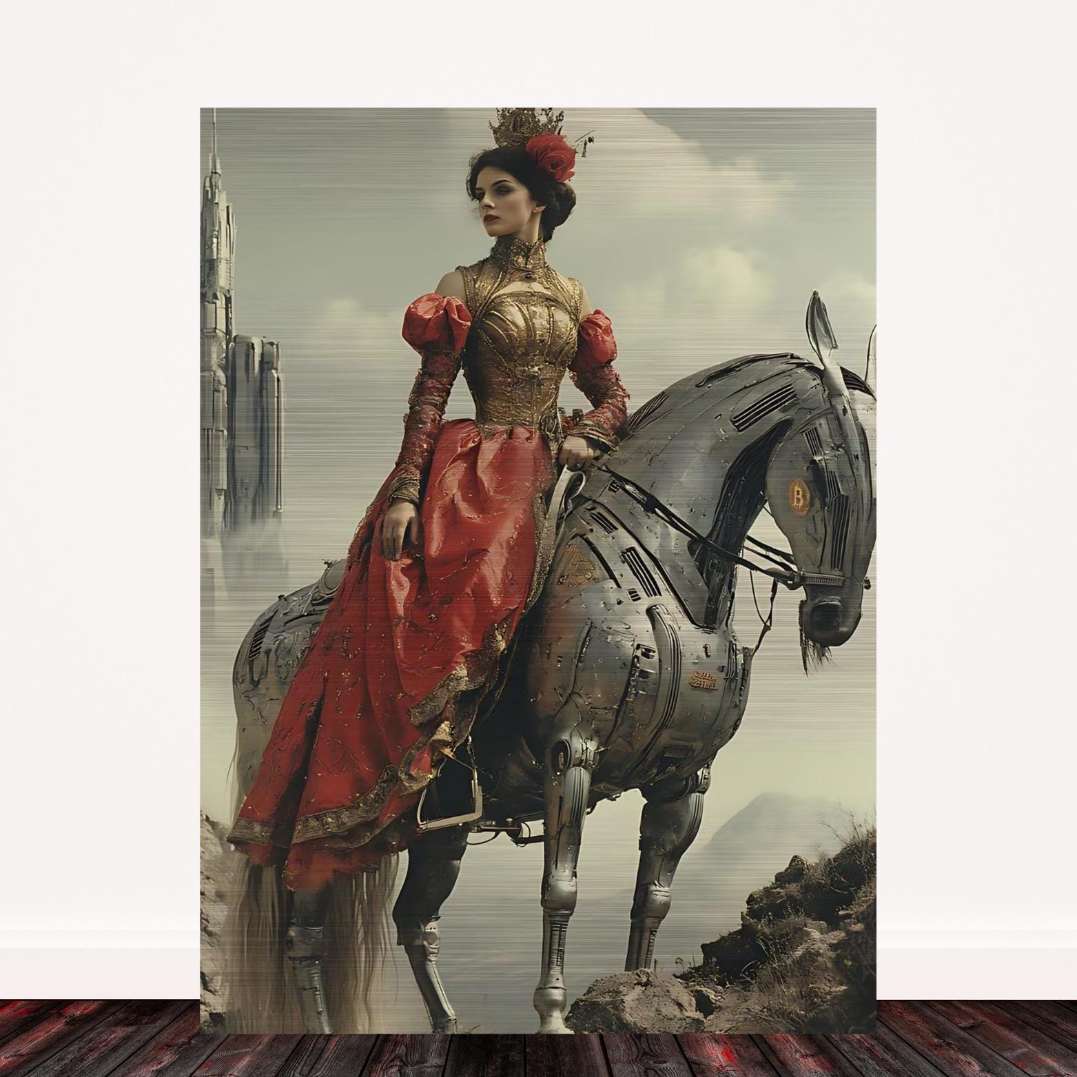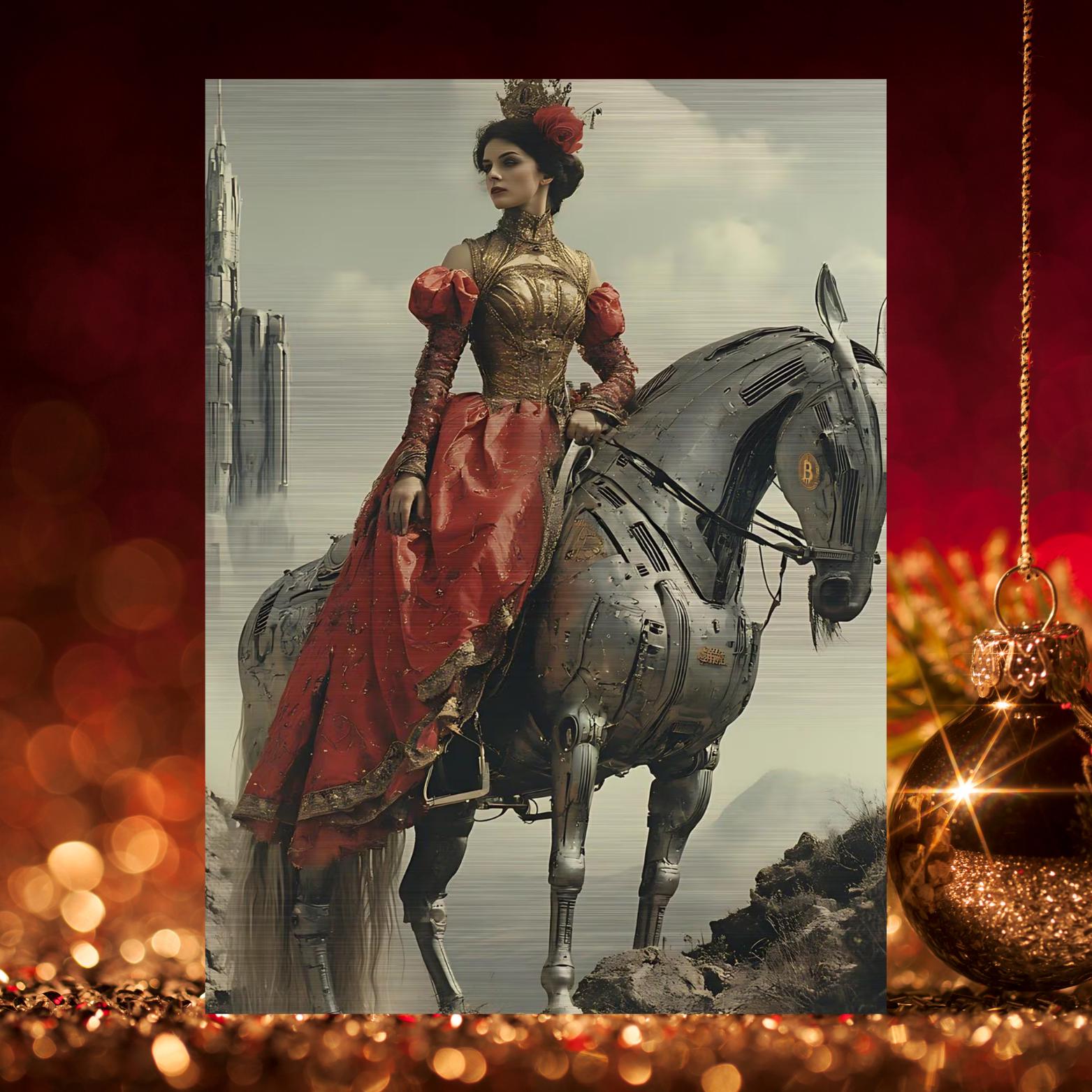 A vision of majesty and devotion, The Bitcoin Paladin depicts a sovereign figure draped in crimson and gold, poised upon a futuristic mechanical steed marked with the Bitcoin insignia. She gazes toward the distant Citadel rising through the mist—a symbol of perseverance, faith, and truth in an age of illusion.