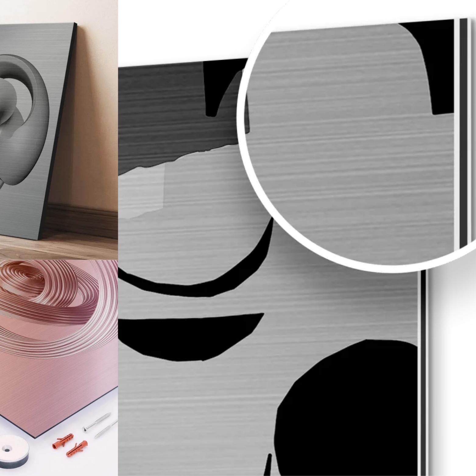 Material: Brushed Silver Aluminum DIBOND® with horizontal grain for dynamic texture.