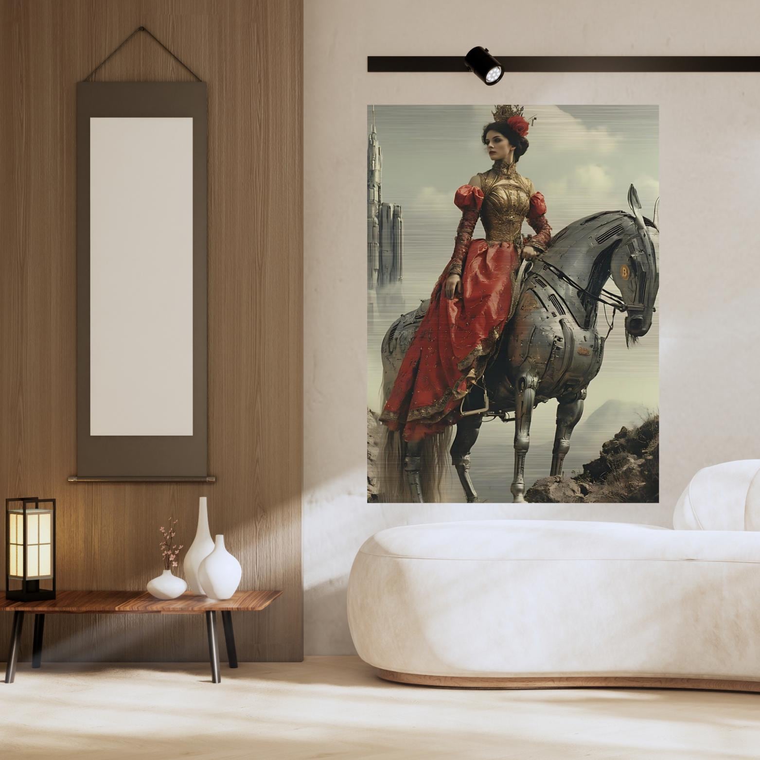 Her attire, inspired by the baroque courts of old, contrasts beautifully with the sleek, machine-crafted elegance of her companion. The fusion of classical grace and technological form reflects the union of art and code, beauty and precision—timeless sovereignty reimagined through Bitcoin’s incorruptible ethos.
