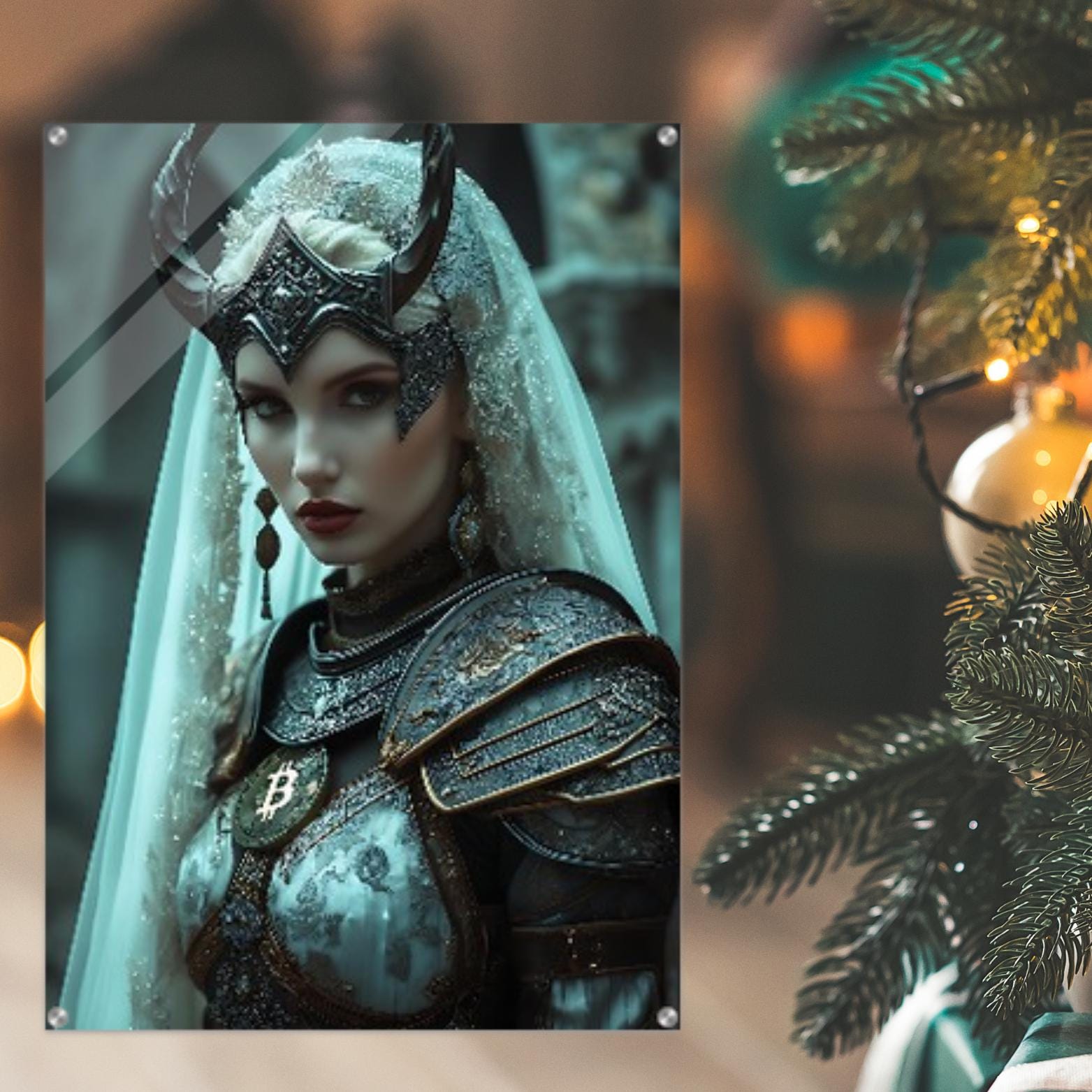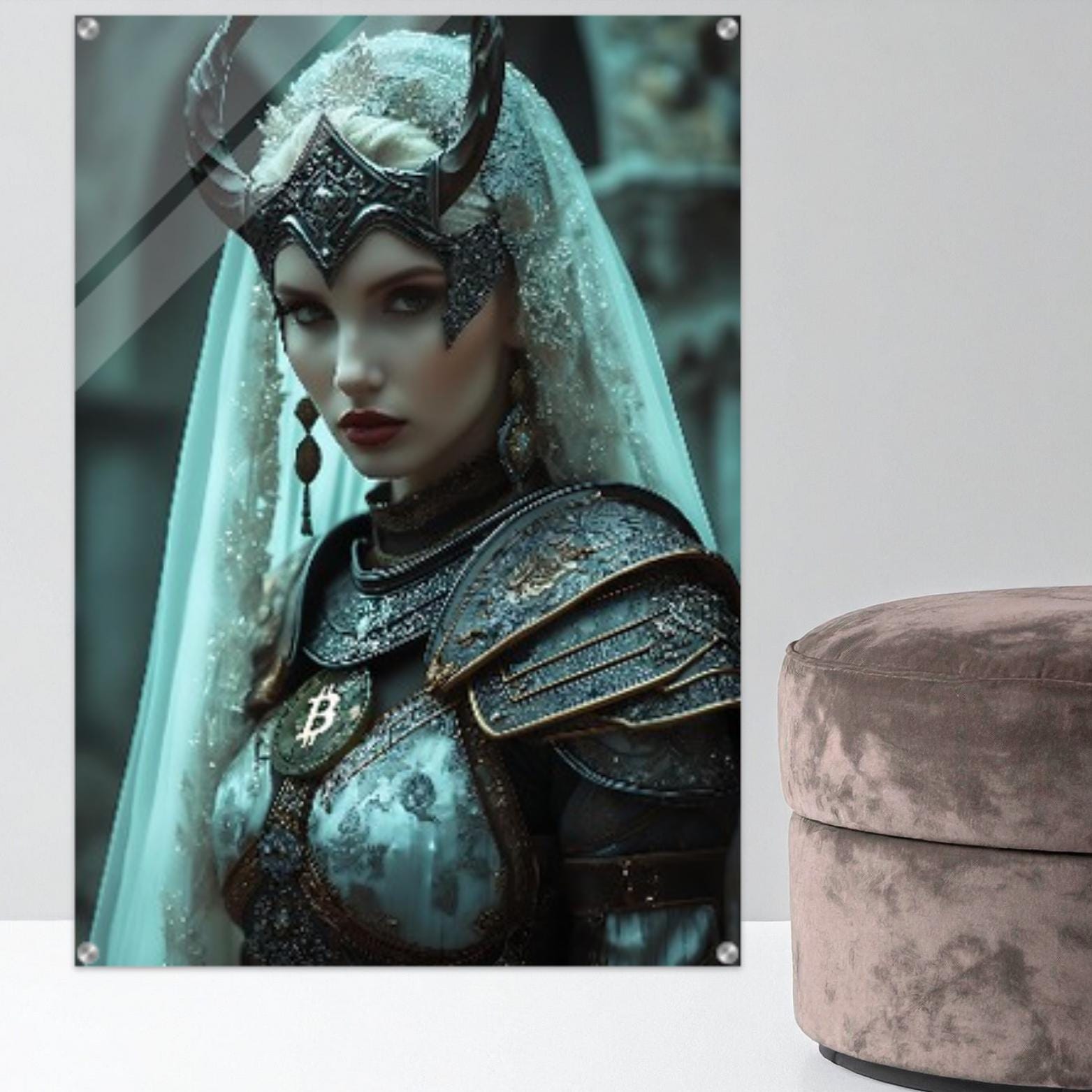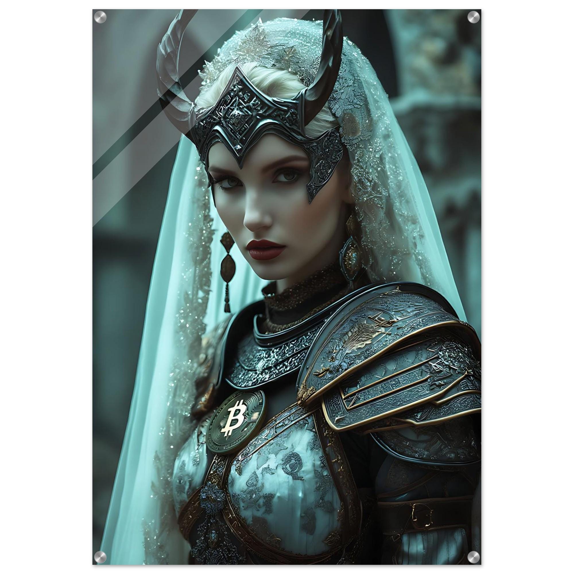A portrait of grace and sovereignty, The Viking Soul captures the inner strength that follows conquest — the quiet power of self-mastery. Draped in luminous fabric and adorned in engraved armor, the figure embodies balance between resilience and beauty. The golden Bitcoin emblem rests upon her chest like a sacred seal, symbolizing incorruptible truth and the eternal flame of sovereignty.