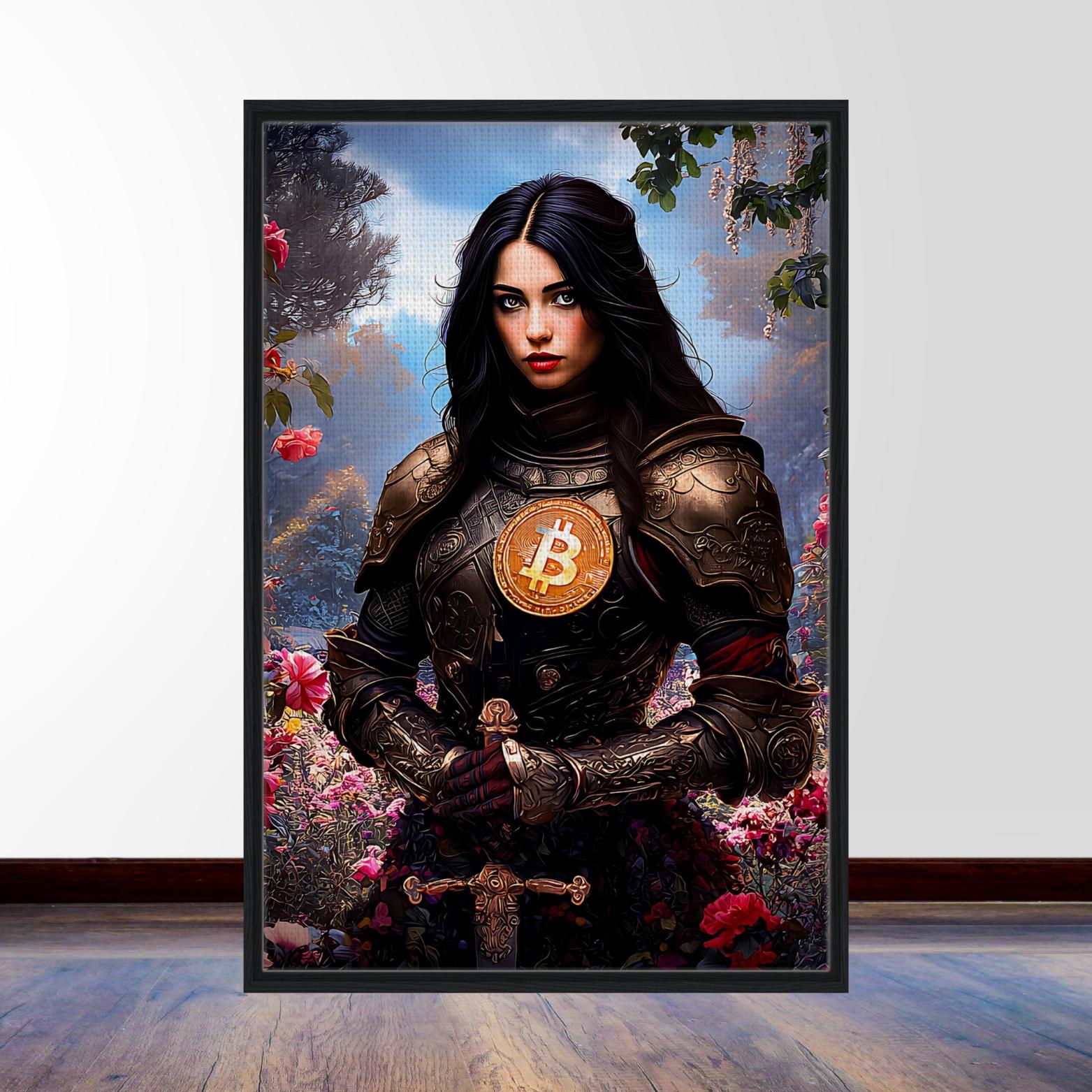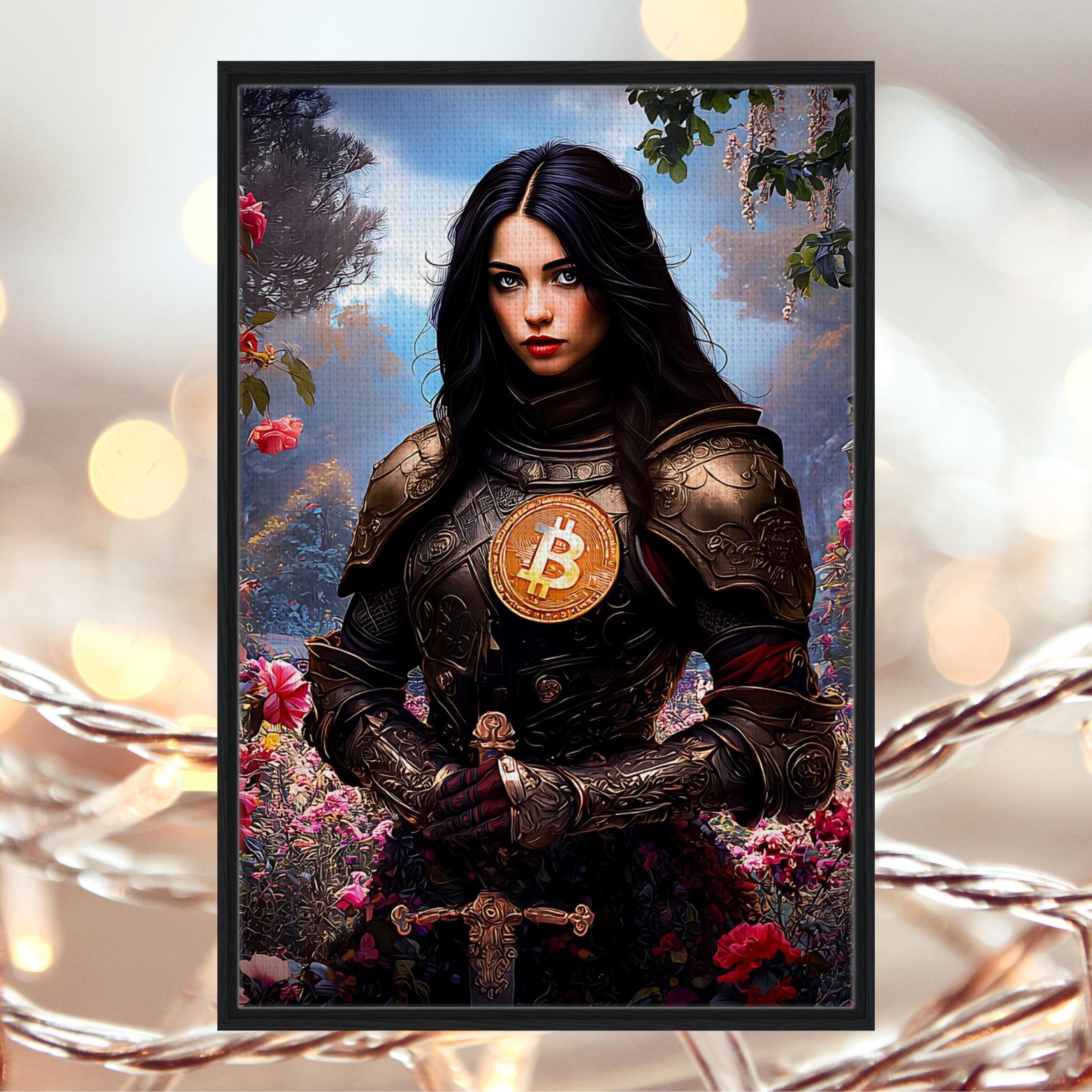 This warrior maiden, clad in ornate armor illuminated by the glowing ₿ emblem, stands in a dreamlike garden where light and shadow intertwine.