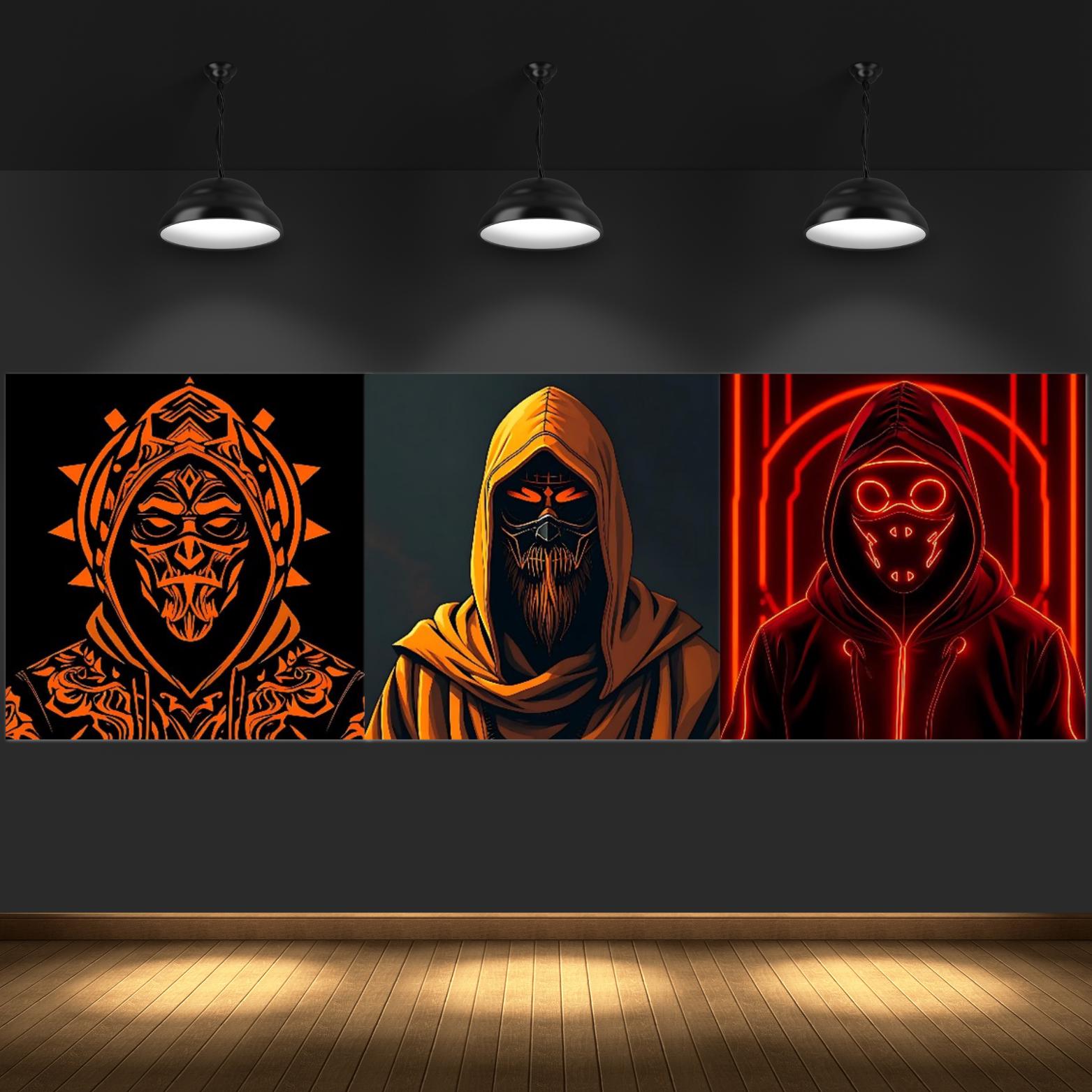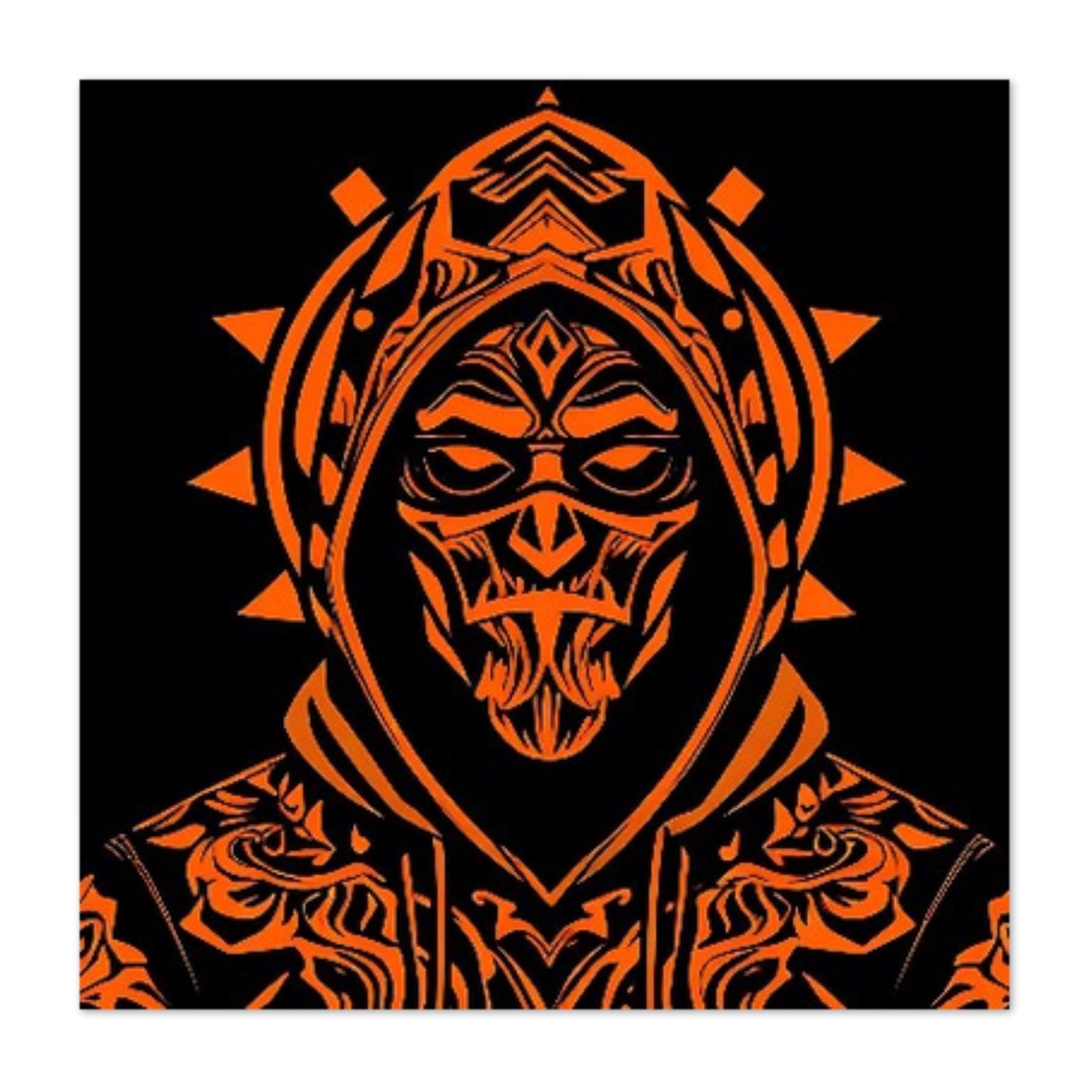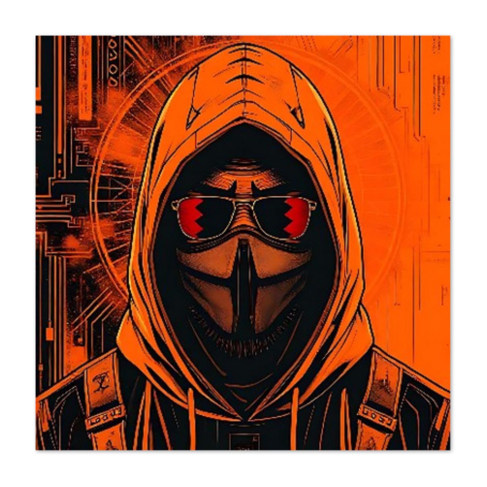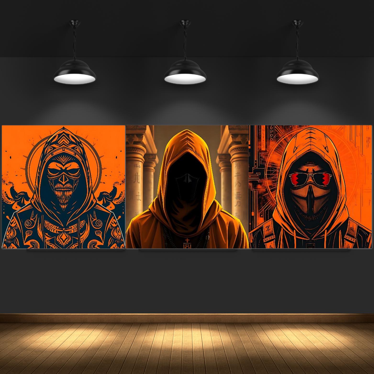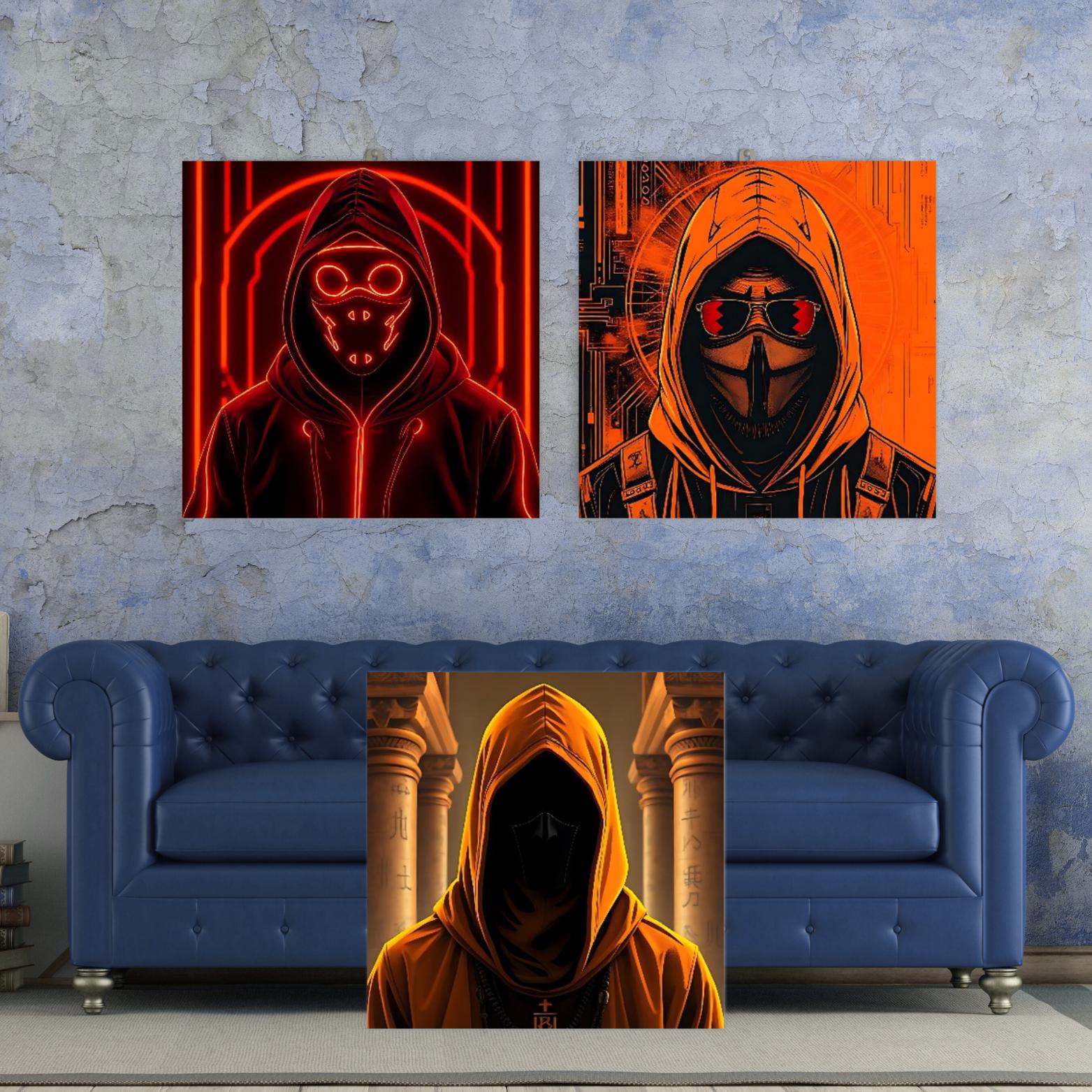 Rendered in striking tones of orange, gold, and black, these artworks fuse cyber aesthetics with sacred geometry and Neo-Baroque symbolism — embodying the energy of rebellion and creation.