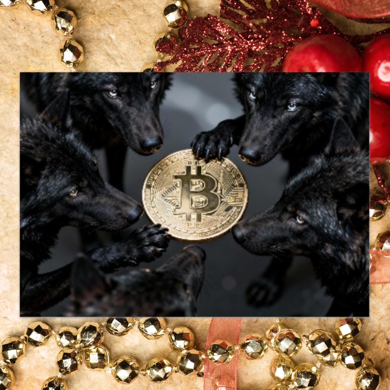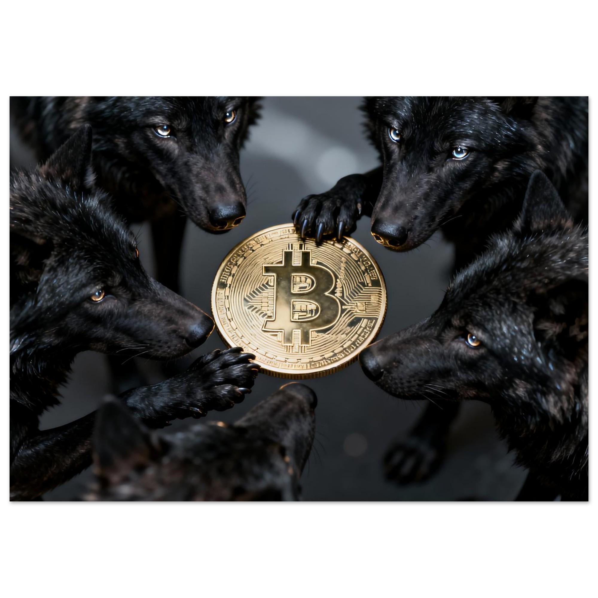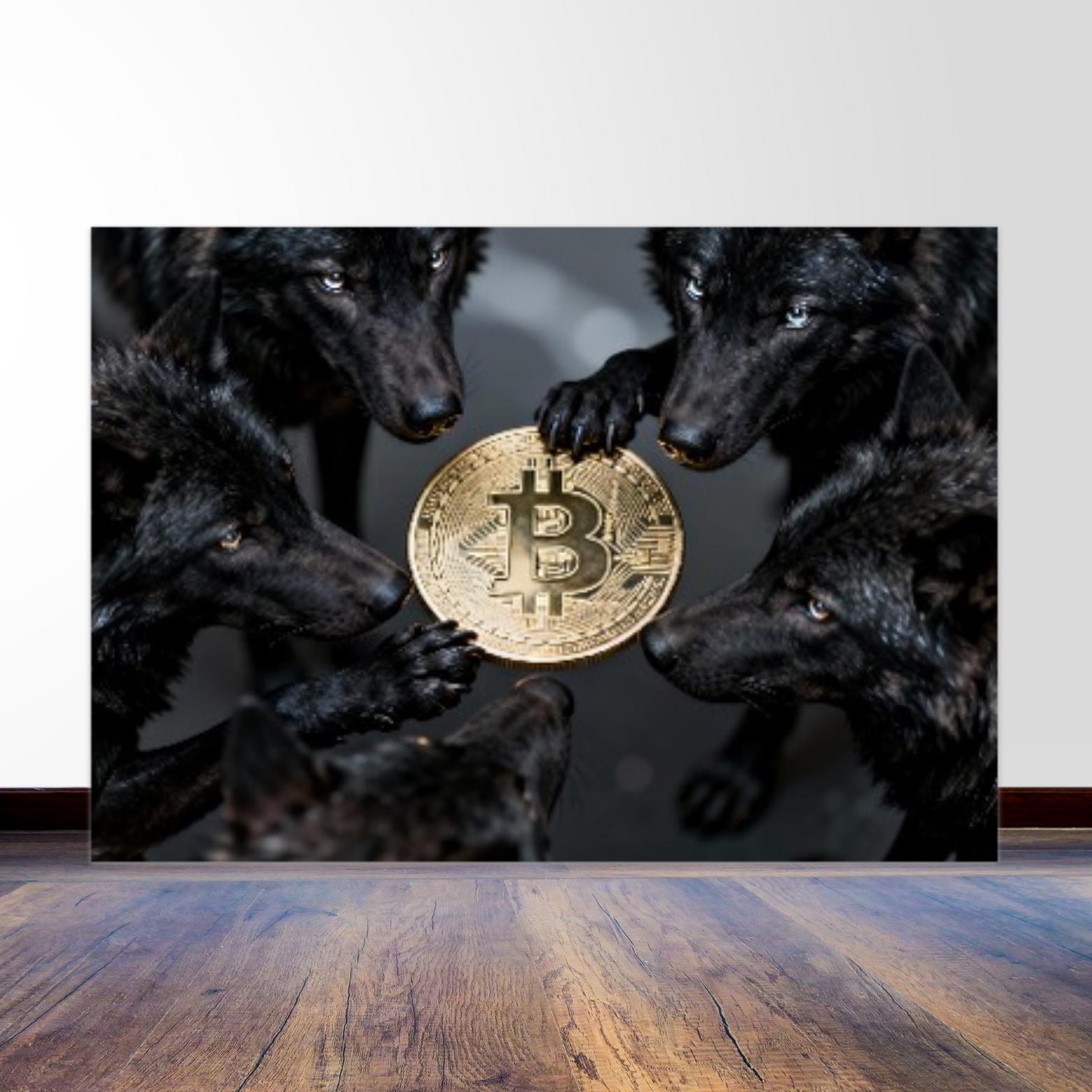 A striking symbol of unity, power, and sovereignty — this artwork captures a pack of black wolves guarding a golden Bitcoin. Their eyes reflect loyalty, strength, and instinct, representing the guardians of value in a digital world.