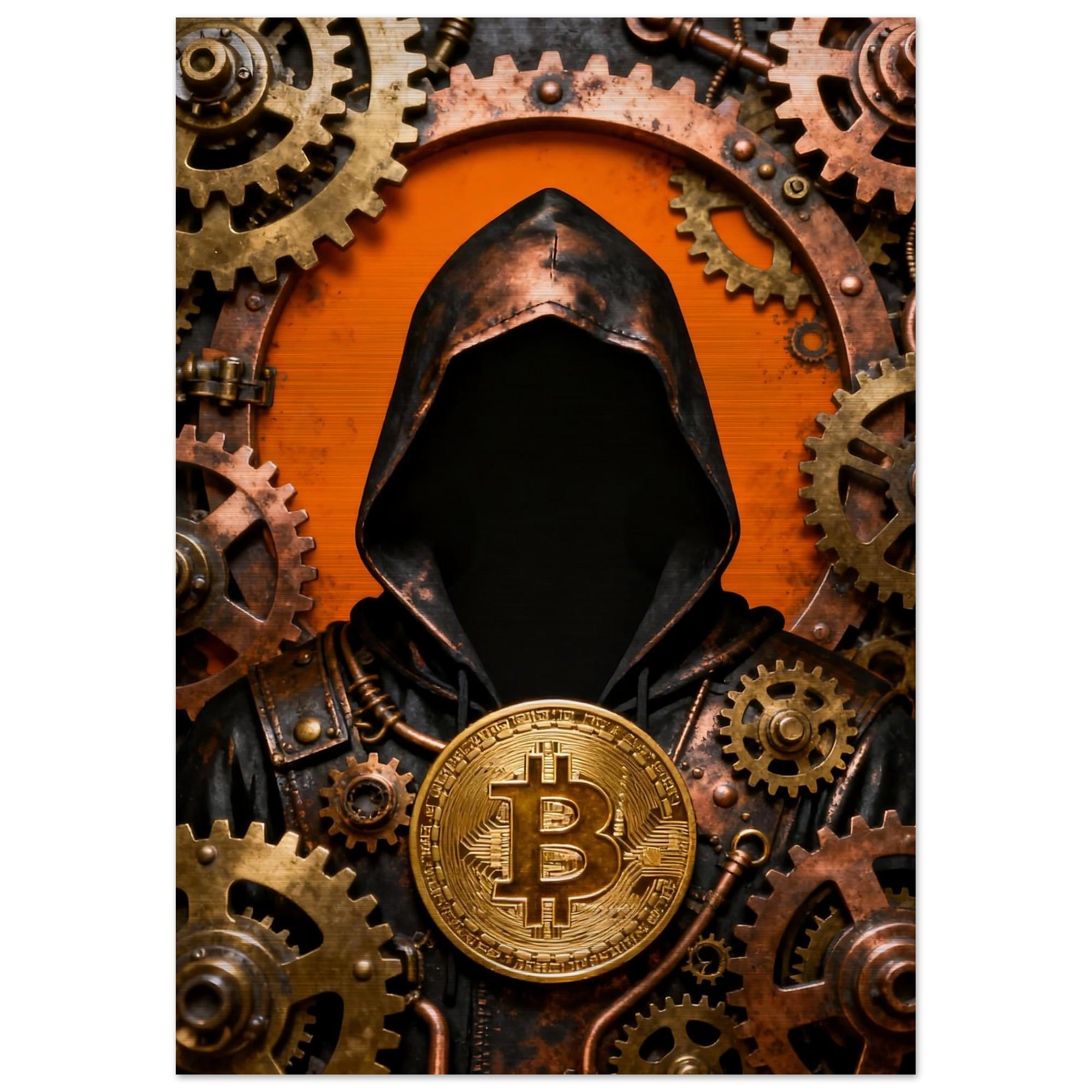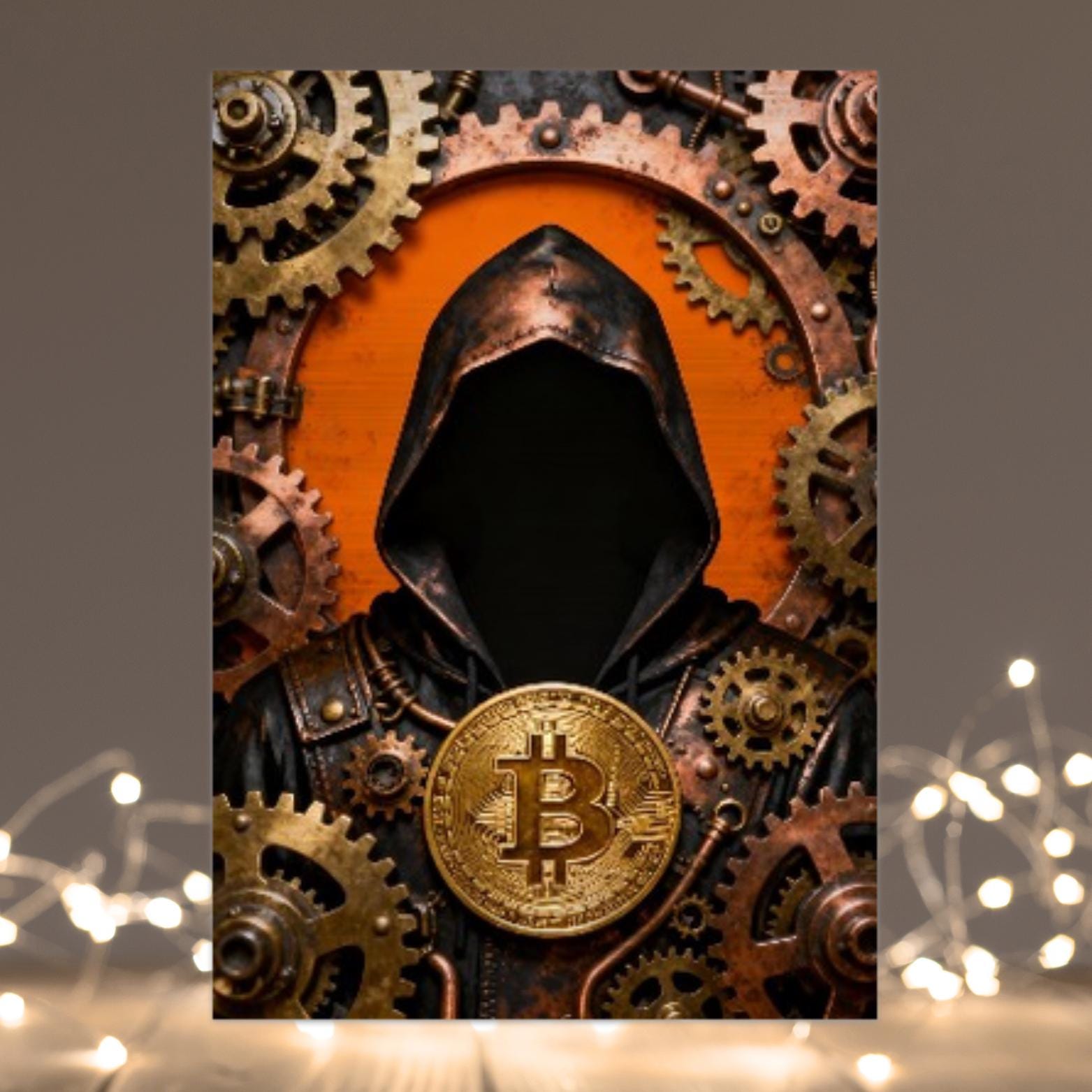 A vision of enigma and precision, The Satoshi Mechanism portrays the hidden architect of truth — the silent force that set the gears of sovereignty in motion. Cloaked in shadow and framed by the machinery of time, this faceless figure represents Satoshi Nakamoto: the invisible creator who built a system so perfect it no longer needed its maker.
