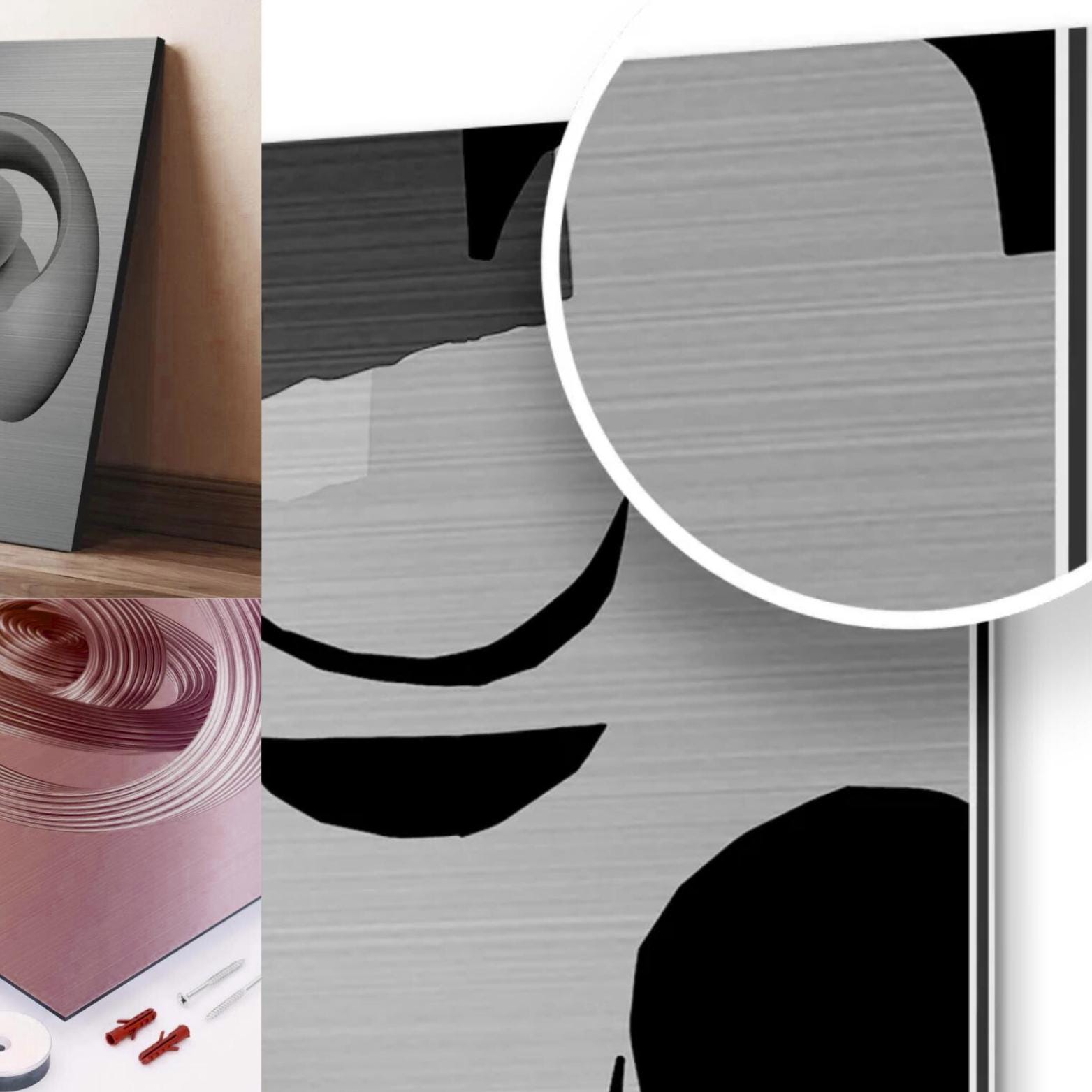 • Material: Brushed Silver Aluminum DIBOND® with horizontal grain for dynamic texture