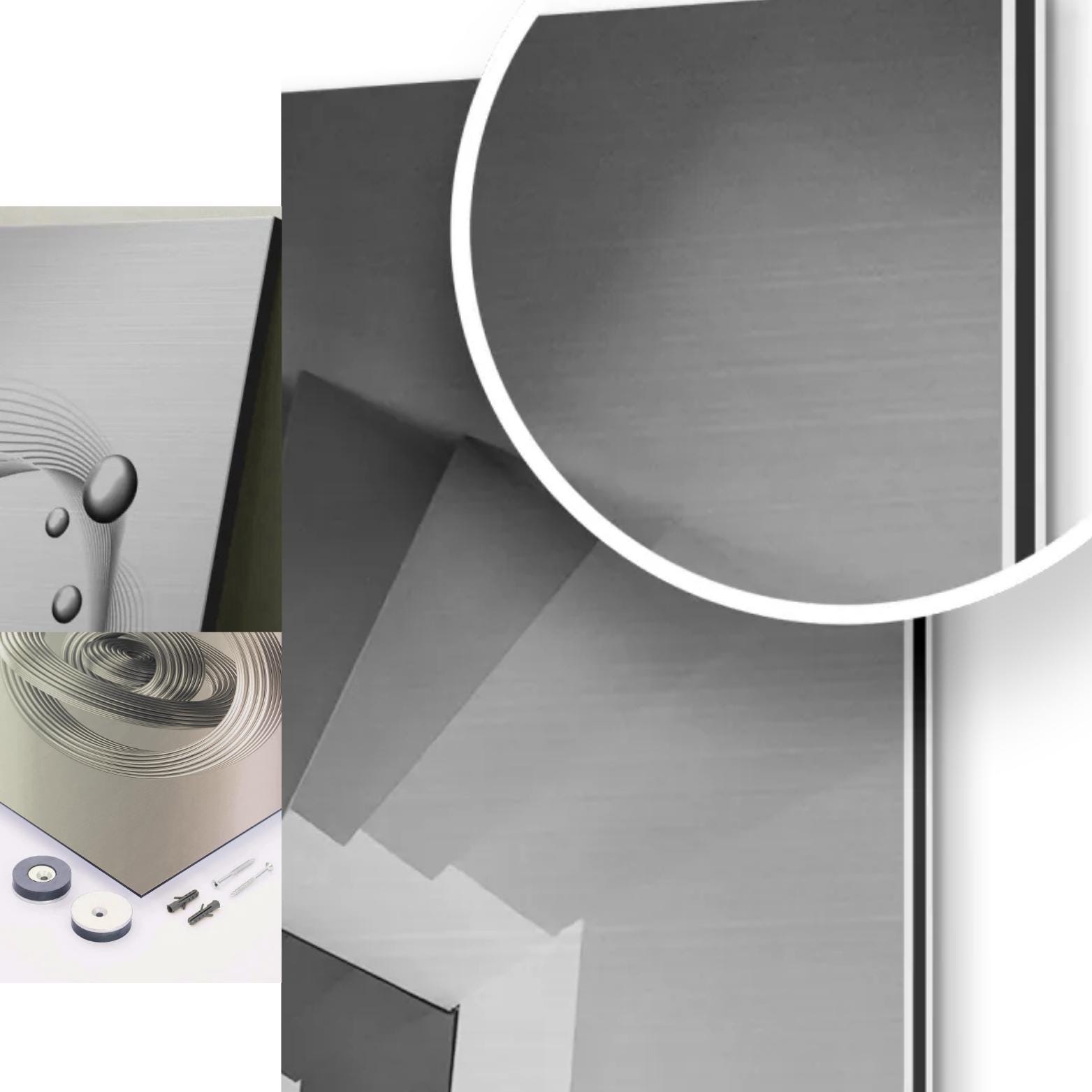 • Material: Aluminum DIBOND® — strong yet lightweight, with two white aluminum layers and a black polyethylene core.