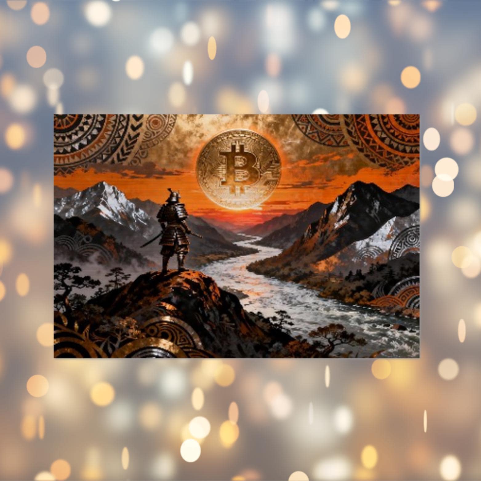 A lone Samurai watches the dawn break over a world transformed by code. The metallic Bitcoin sun rises above the valley, casting its glow across rivers carved like circuitry and mountains marked by ancient symbols.