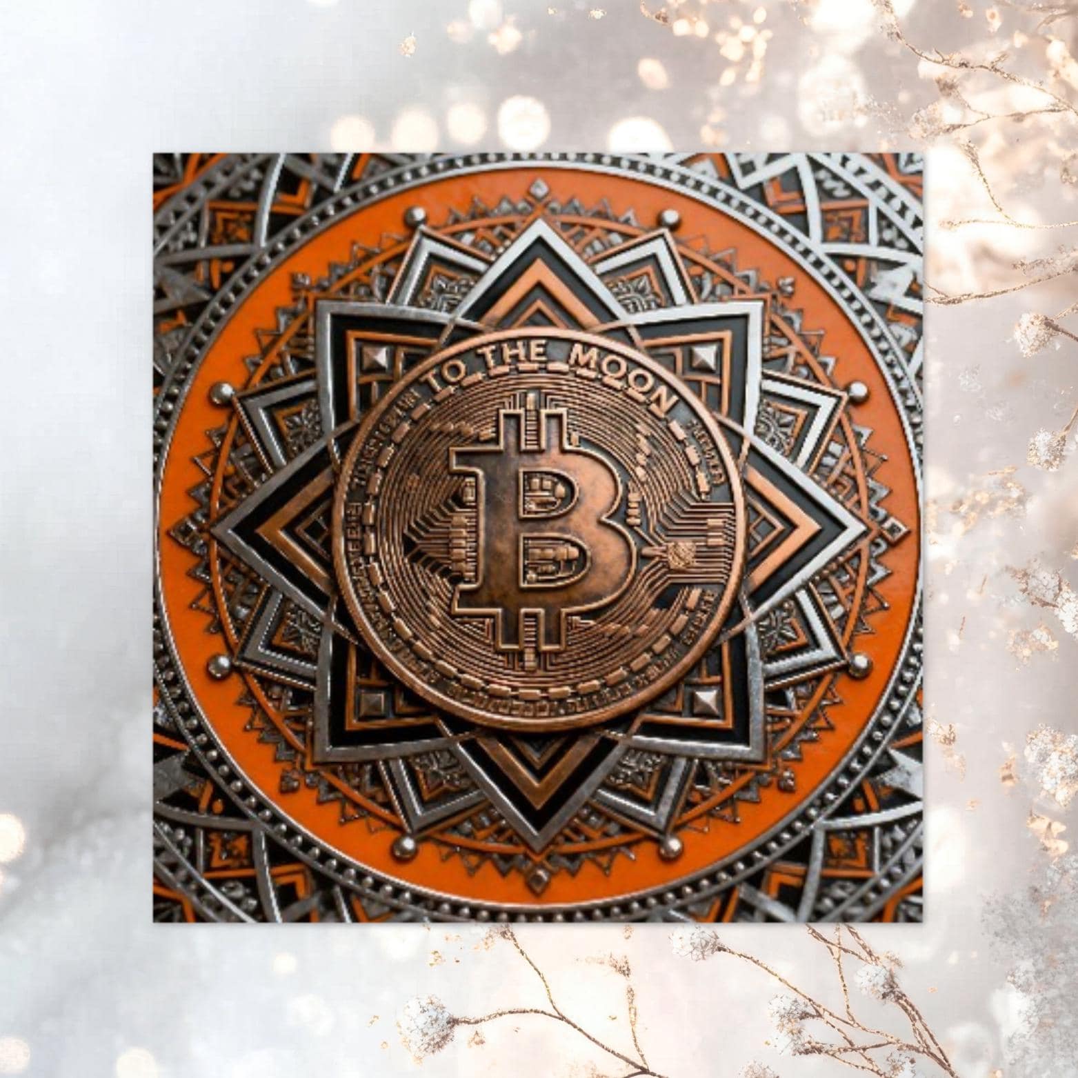 At the center of this design, the Bitcoin medallion shines like a timeless seal, framed by layered geometric patterns that radiate outward with perfect symmetry. The engraved phrase “TO THE MOON” reinforces Bitcoin’s culture of resilience and upward vision — a message known by early adopters, builders, and collectors worldwide.